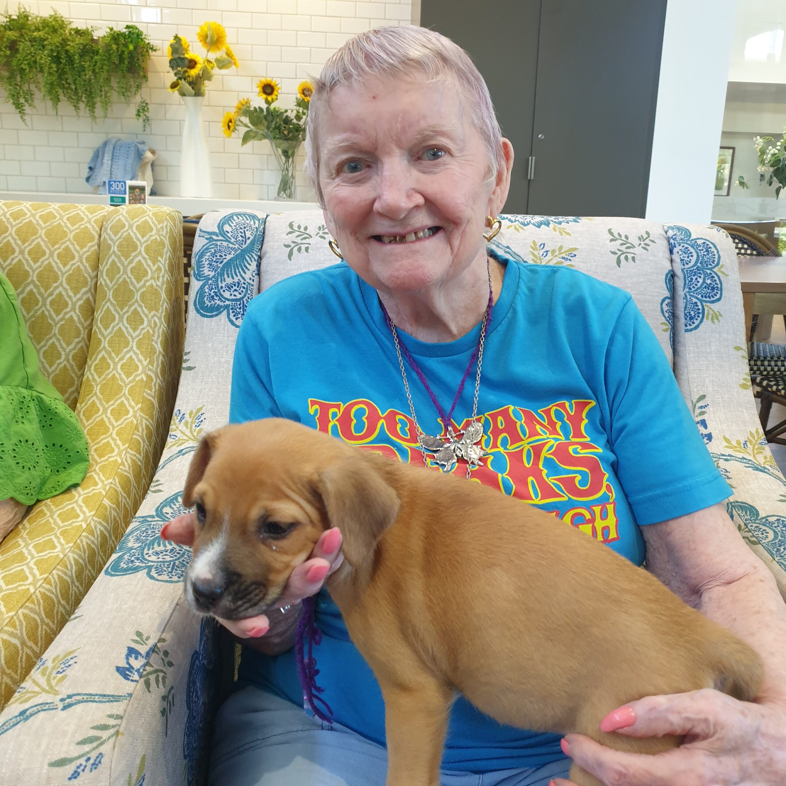 At Kewarra Aged Care, we love animals. We welcome pets into our home as it helps residents with their mental health by decreasing stress and anxiety, helps to combat loneliness and brings a lot of joy. We work alongside the Young Animal Protection Society (YAPS) in Cairns to have six-week-old puppies come to visit the residents once a month. YAPS is a not-for-profit organisation that cares for homeless and unwanted dogs and cats. The overall goal of the organisation is to provide an animal welfare service aiming at excellence in the broader Cairns region. YAPS is one of the very few animal refuges in the area providing this service to the community. There is not a sad face to be seen when the puppies come into our home with plenty of energy, cuteness and cuddles from residents. Kewarra Aged Care Lifestyle Coordinator, Nicky Misfud, says ‘There are not enough words to express the feeling you have watching the residents interact with the puppies, their facial expressions tells the story. It makes me feel very humble being able to make this happen for them.’ We have many residents at the home who had pets growing up and throughout their lives before moving to Kewarra so many residents feel that visits from animals provide a sense of love and companionship. For Kewarra resident, Dawn, her love for animals has only grown whilst living at the home. Dawn tells us that she always had dogs throughout her life. She had a Kelpie, Whiskey, which she named because they used to host a lot of parties at their house with whiskey being a popular drink of choice. ‘Whiskey used to follow me to the factory where I worked and would sit out the front door and wait for me and when I finished he would walk next to me all the way home,’ says Dawn. When asked what she liked most about having furry friends being able to visit the home, Dawn replies, ‘I love having the Cairns Police K9 Squad come with their working dog. The lovely black lab was so content and when he was asked to find an item, he jumped up and went straight for it.’
